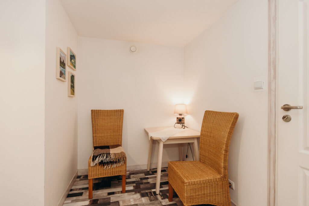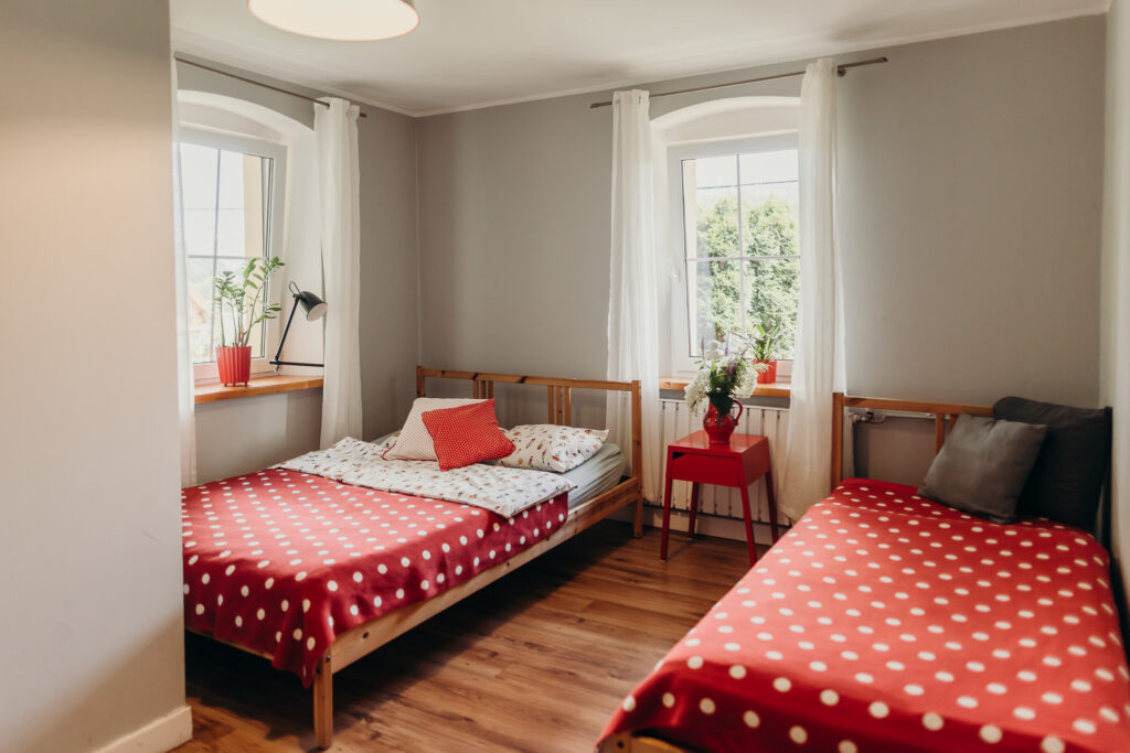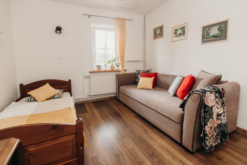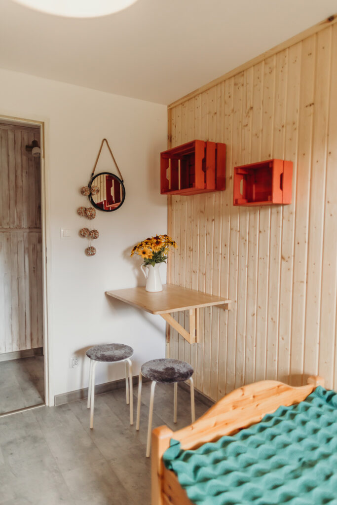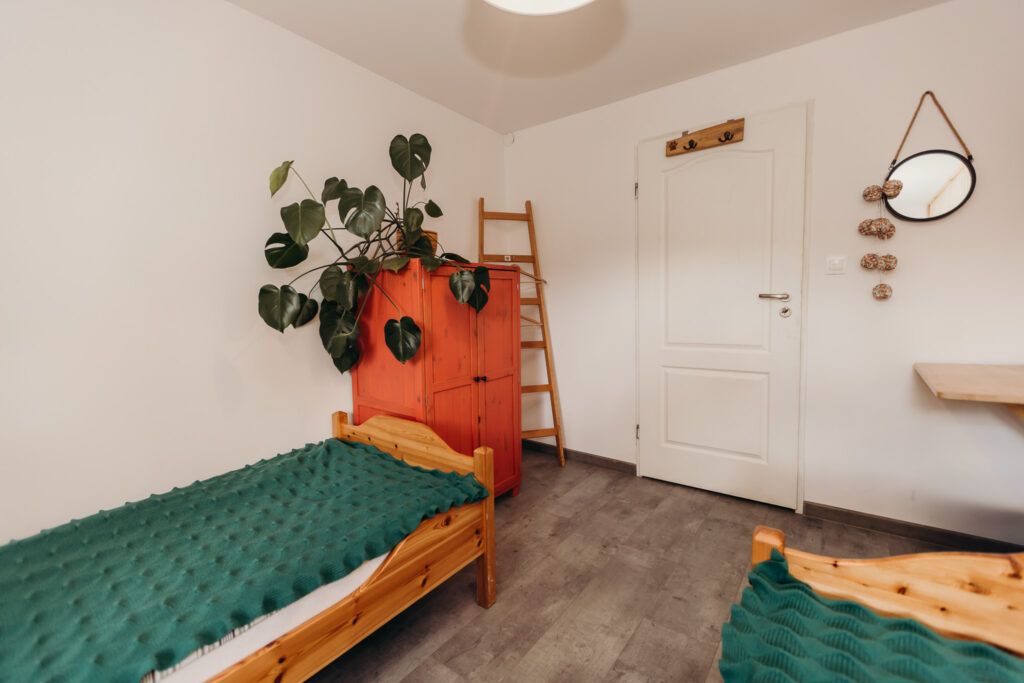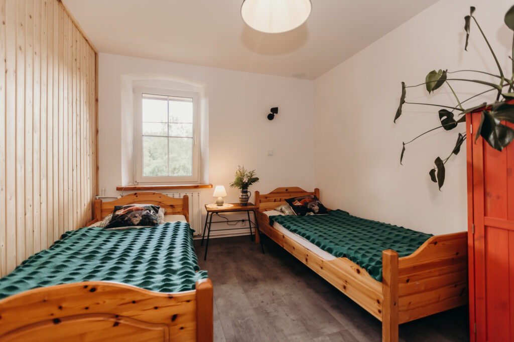 Gościom oferujemy noclegi w 5 pokojach, położonych na pierwszym piętrze. Na parterze znajdują się części wspólne: w pełni wyposażona kuchnia z drewnianymi ławami, salon z kominkiem oraz toaleta.