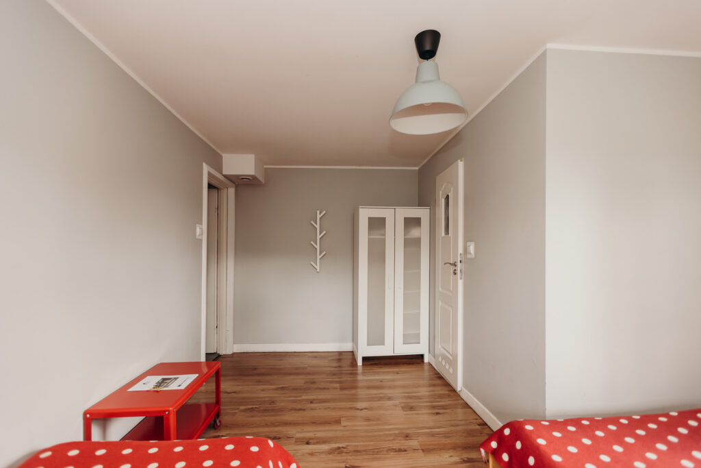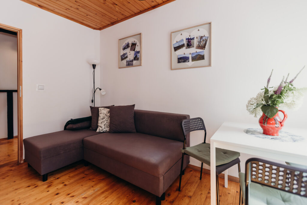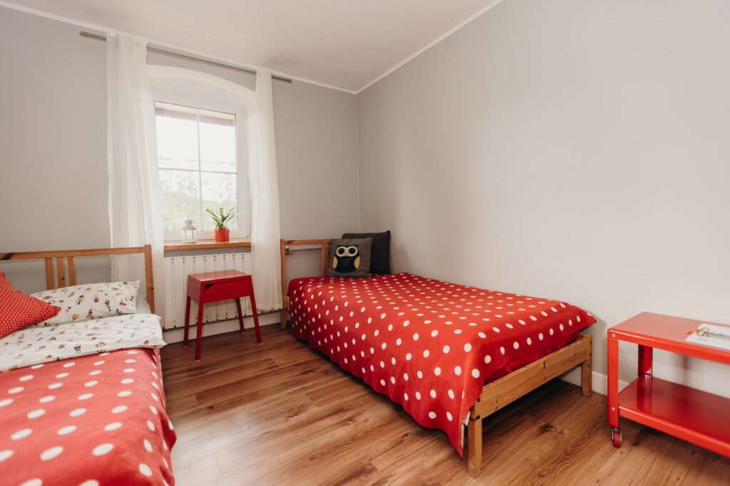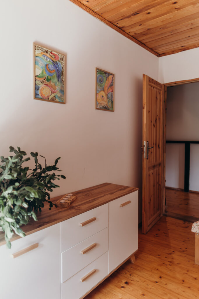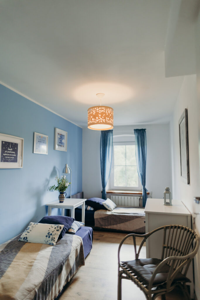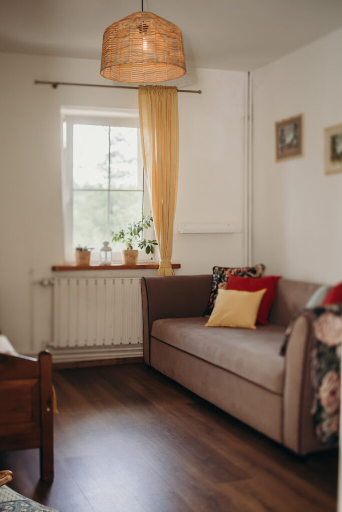 Gościom oferujemy noclegi w 5 pokojach, położonych na pierwszym piętrze. Na parterze znajdują się części wspólne: w pełni wyposażona kuchnia z drewnianymi ławami, salon z kominkiem oraz toaleta.