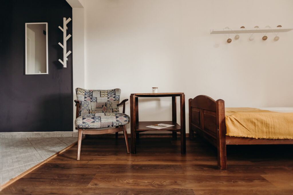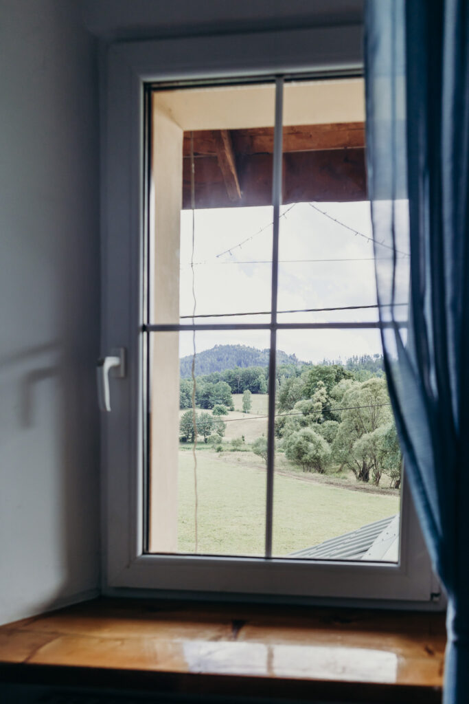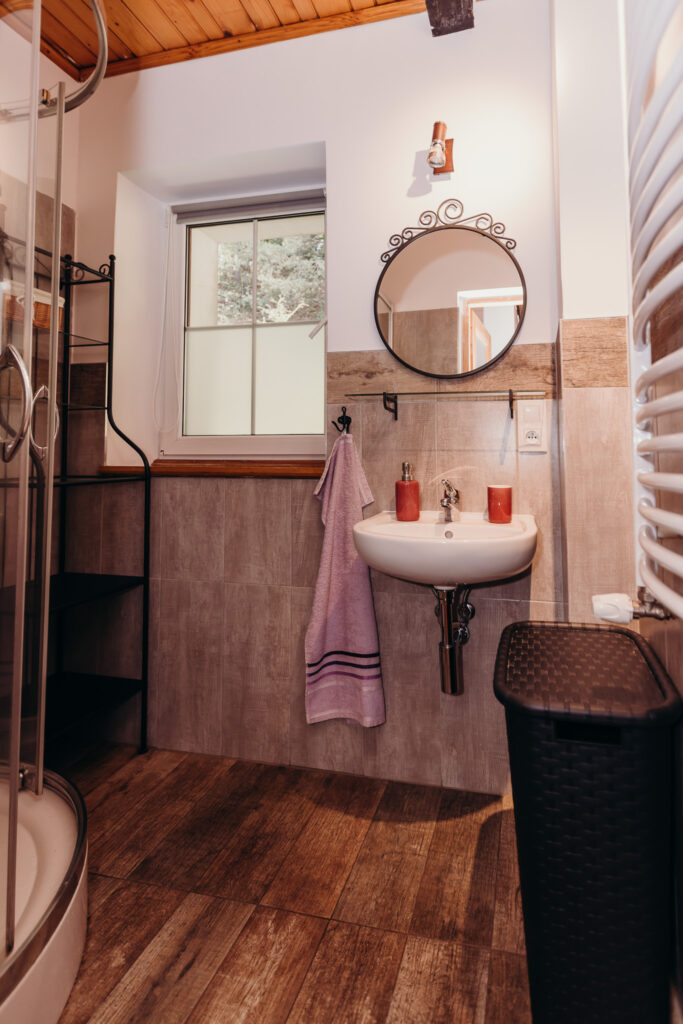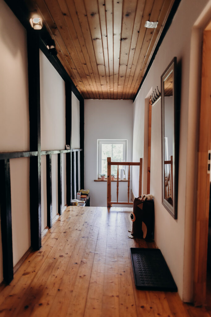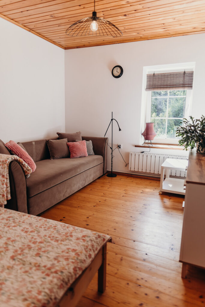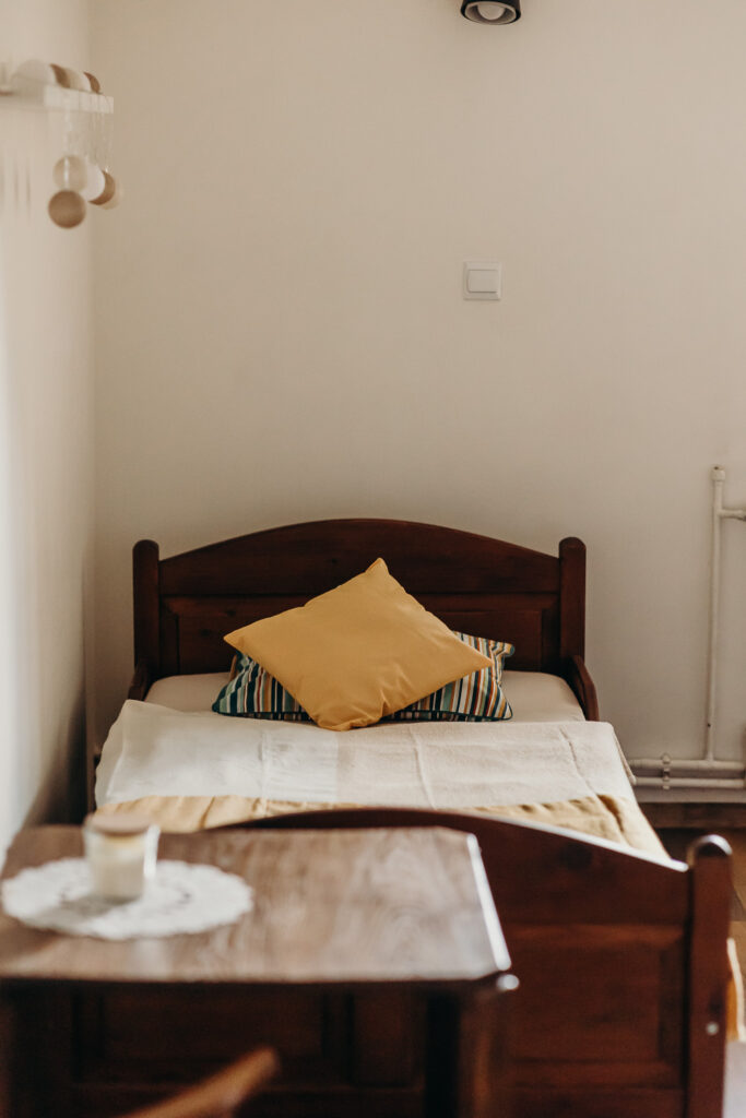 Gościom oferujemy noclegi w 5 pokojach, położonych na pierwszym piętrze. Na parterze znajdują się części wspólne: w pełni wyposażona kuchnia z drewnianymi ławami, salon z kominkiem oraz toaleta.