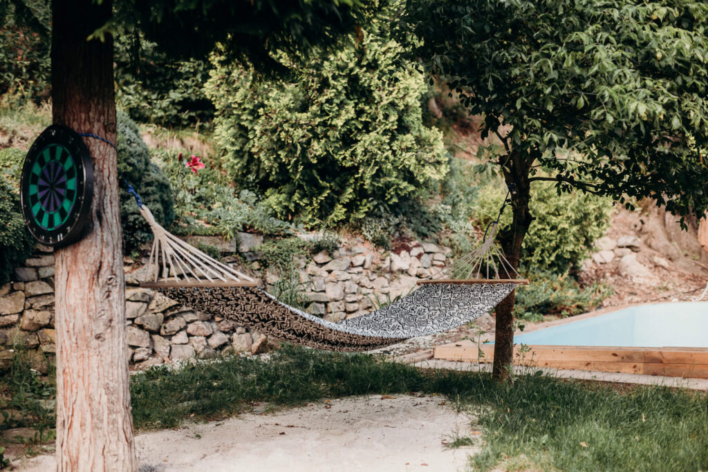 W ogrodzie można zjeść śniadanko na tarasie, odpocząć na leżakach lub hamaku, schłodzić się w basenie, a także pogrillować czy zrobić nastrojowe ognisko.