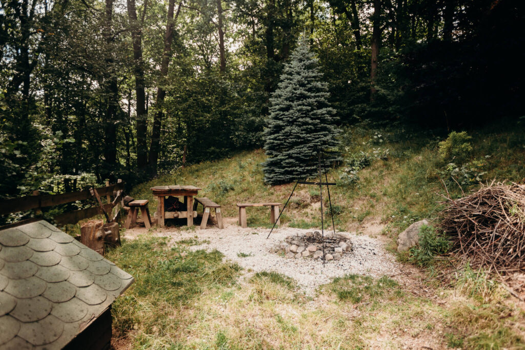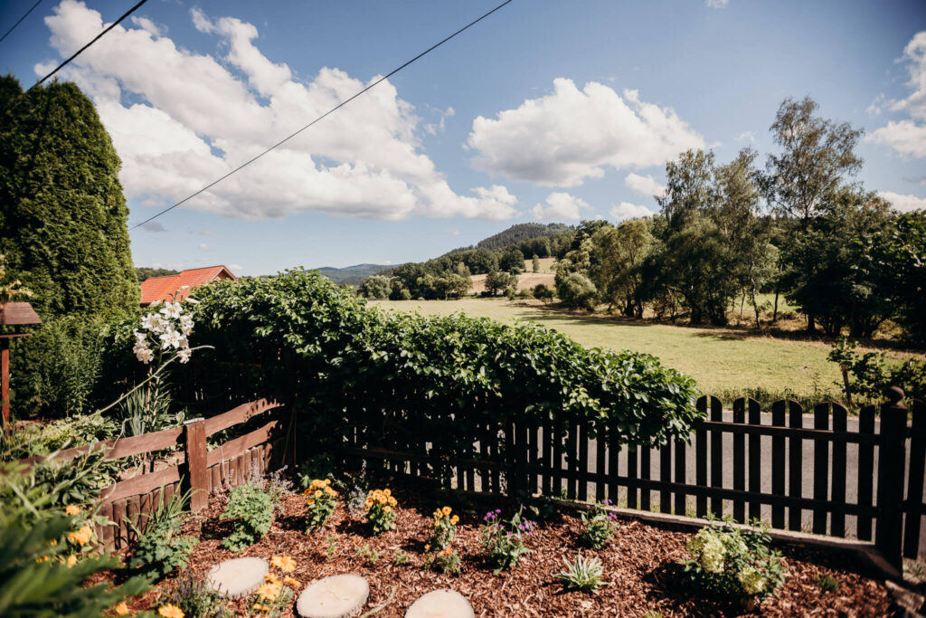 Ogród jest miejscem, które szczególnie lubimy. Nie znajdziecie tu wiele dopieszczonych rabatek, ale dużo drzew i krzewów, które wtapiają się w otaczający krajobraz. Z górnego tarasu widok zapiera dech w piersiach. Widać wijącą się w dolinie rzekę, pagórki, Sokolik i królową Karkonoszy Śnieżkę.